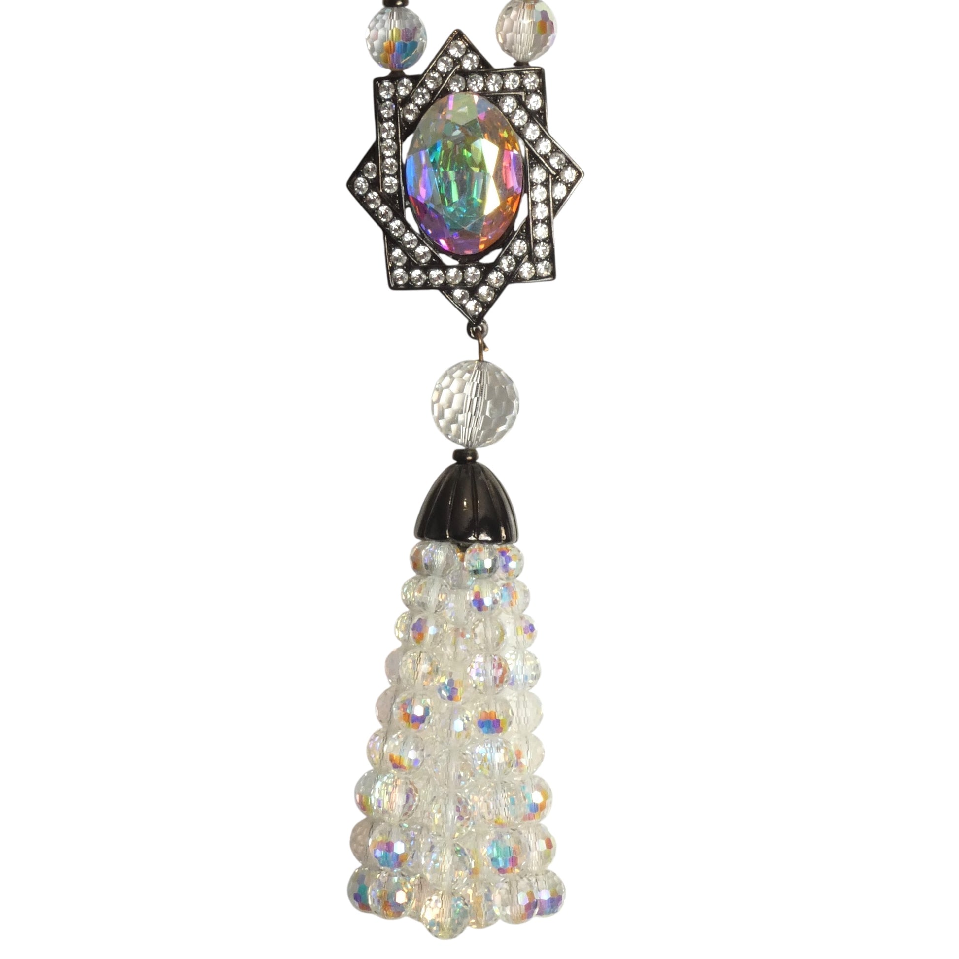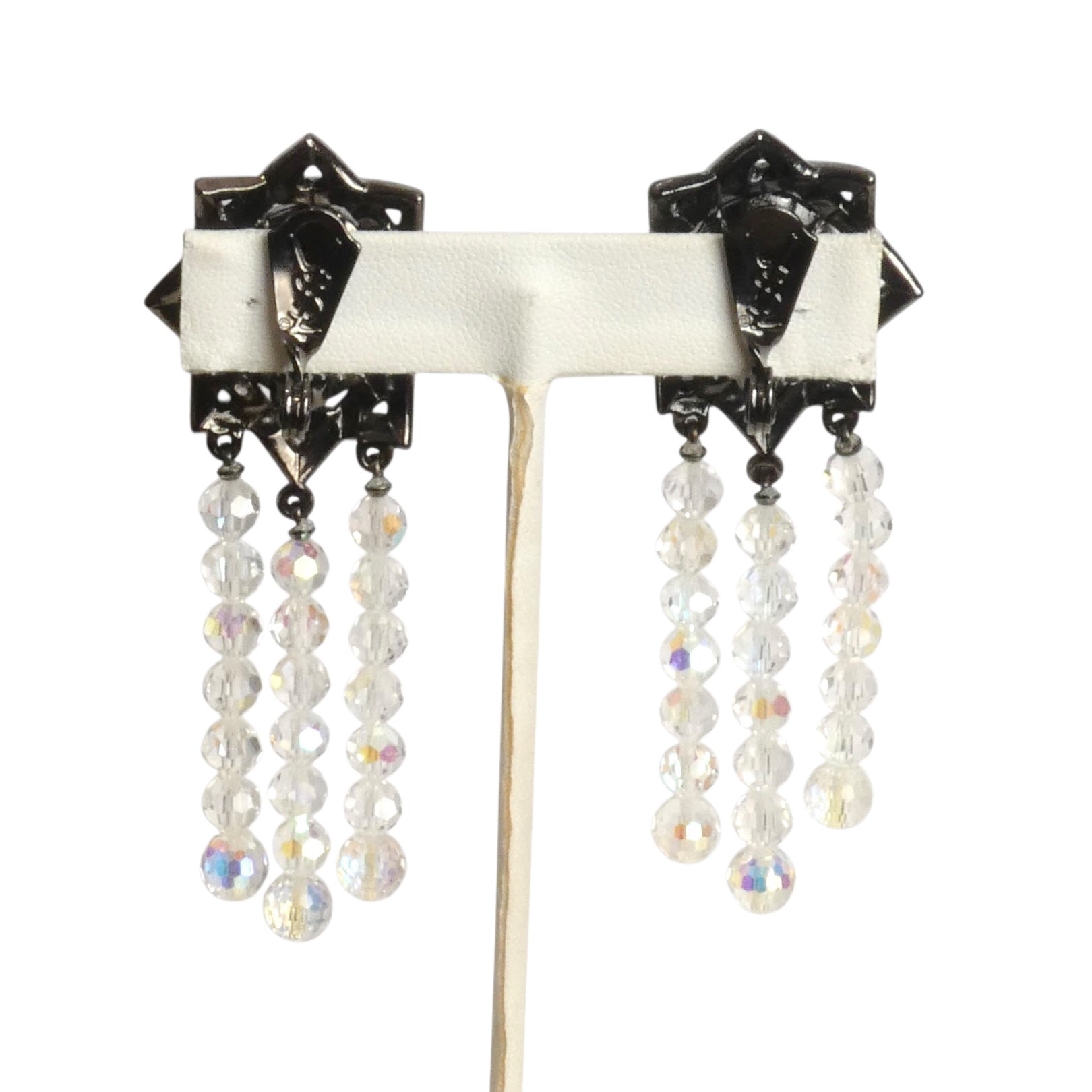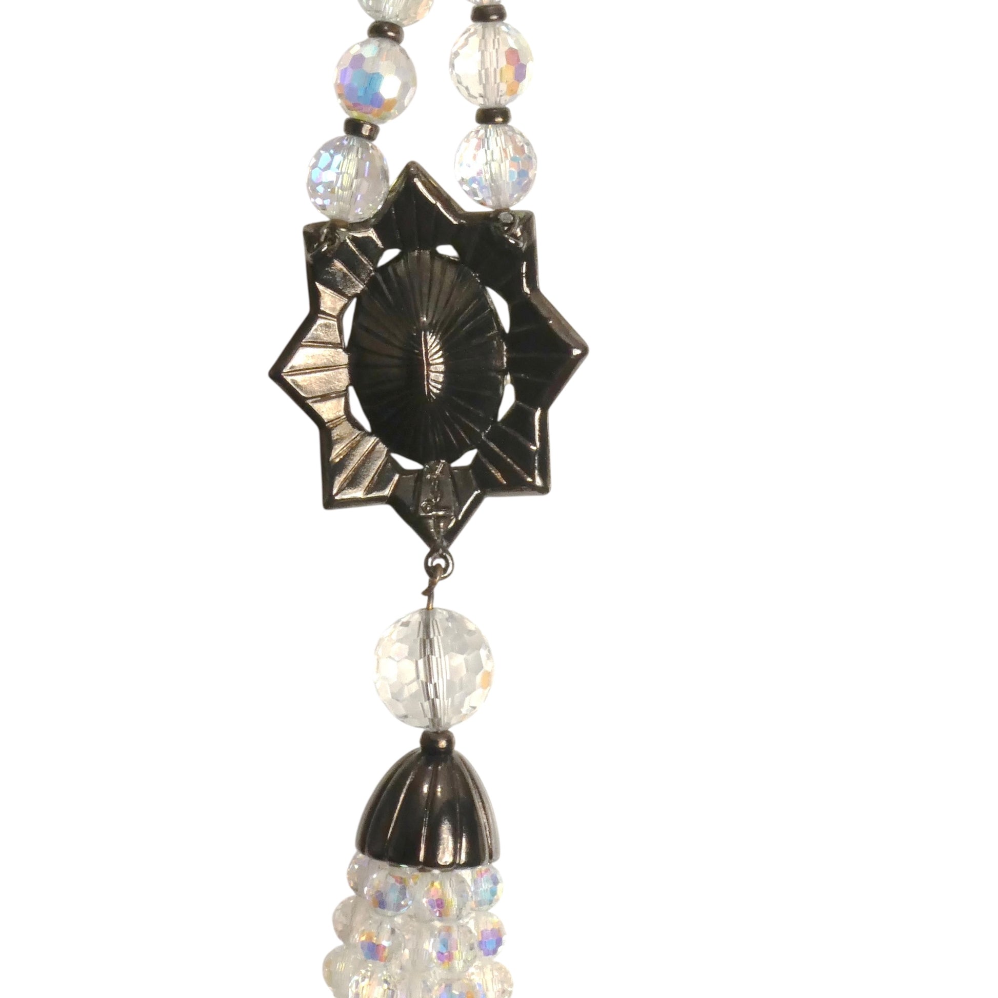 Description: This stunning 1980s Yves Saint Laurent parure features a necklace, earrings, and brooch crafted in dark silver gilt metal. The long necklace is strung with faceted glass beads that shimmer in pastel tones and showcases a large star medallion adorned with sparkling rhinestones and a central gemstone. A delicate glass bead fringe tassel hangs from the medallion’s base, completing the piece with elegant movement. The brooch secures with a locking pin back, while the earrings feature tension clips for a secure fit.