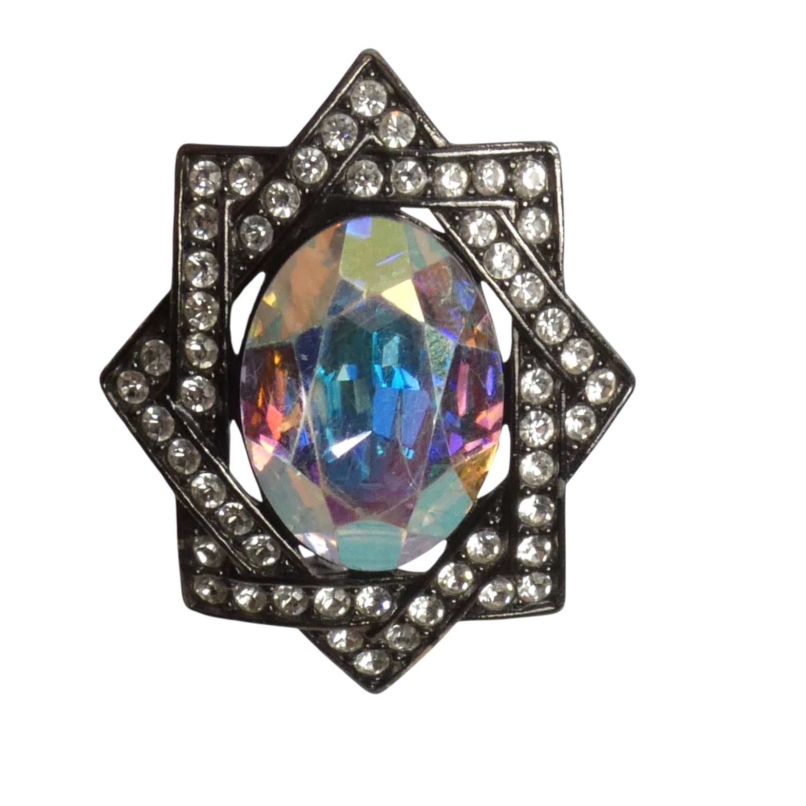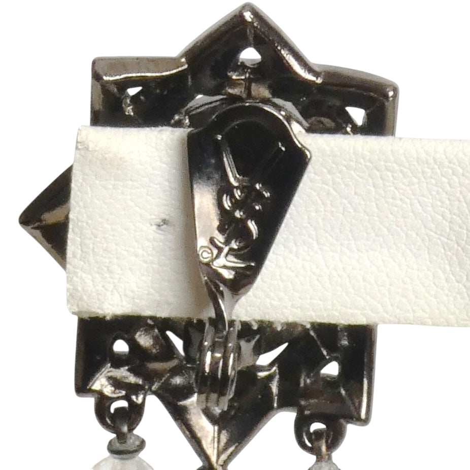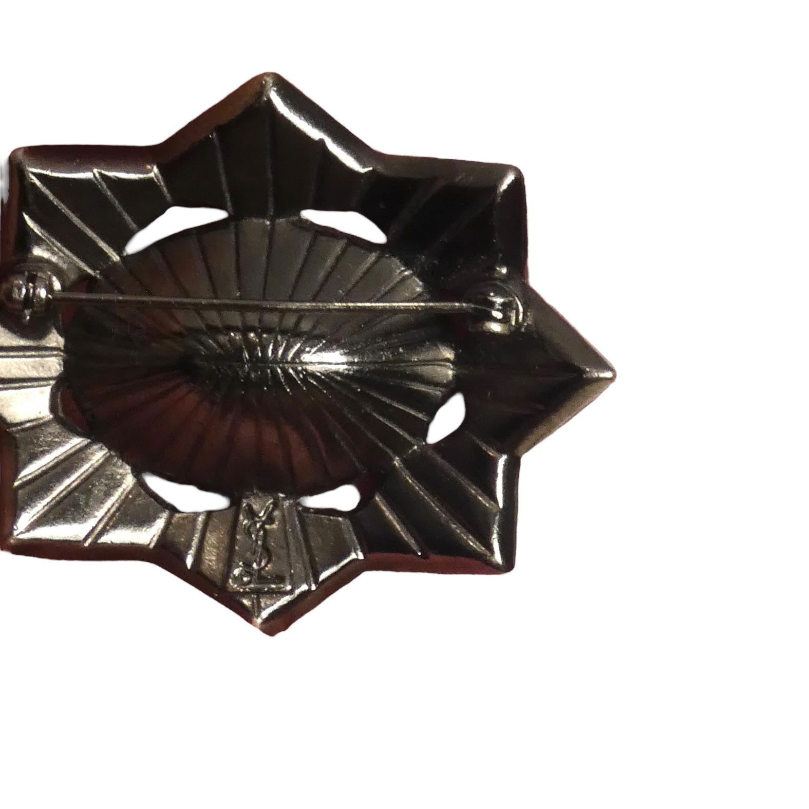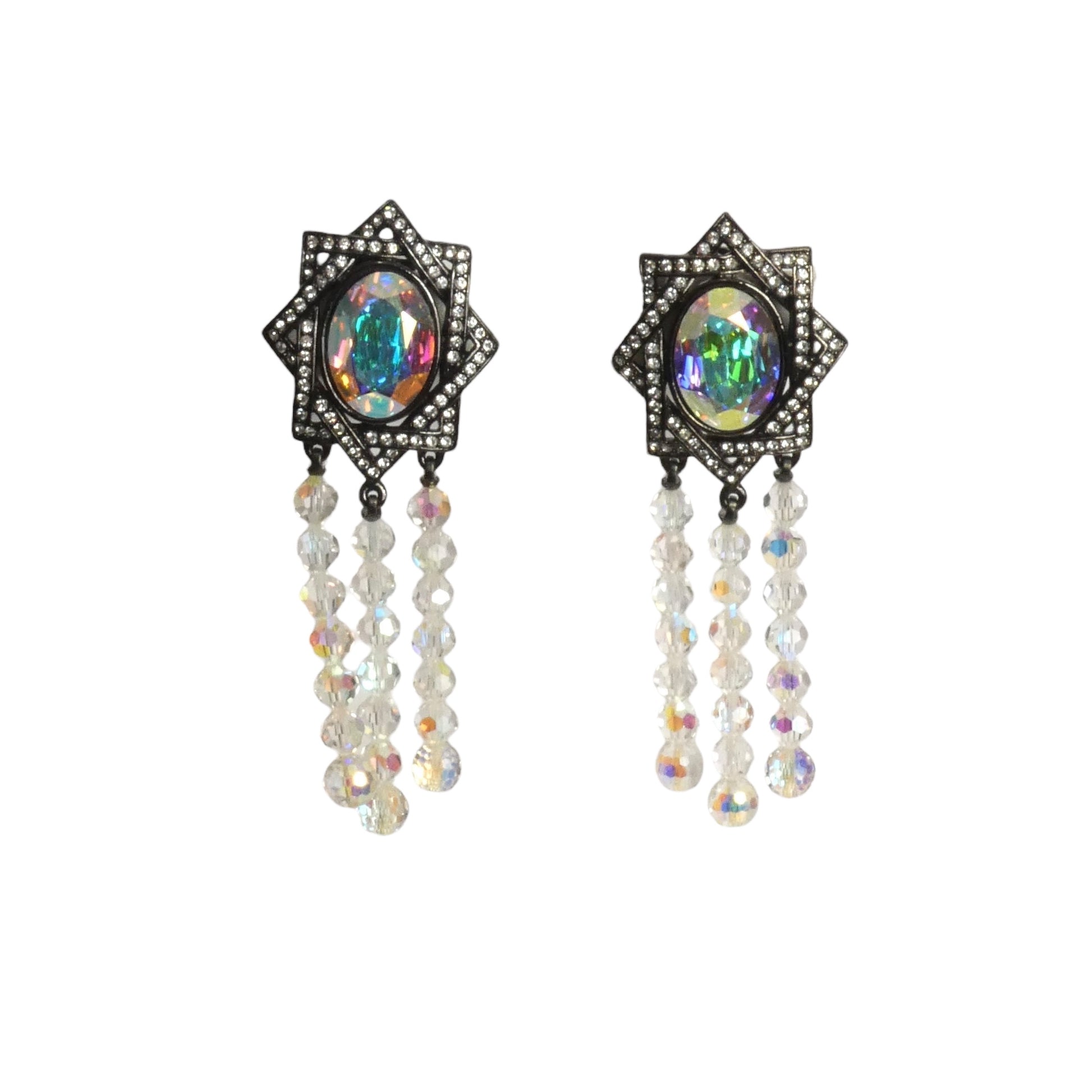 Description: This stunning 1980s Yves Saint Laurent parure features a necklace, earrings, and brooch crafted in dark silver gilt metal. The long necklace is strung with faceted glass beads that shimmer in pastel tones and showcases a large star medallion adorned with sparkling rhinestones and a central gemstone. A delicate glass bead fringe tassel hangs from the medallion’s base, completing the piece with elegant movement. The brooch secures with a locking pin back, while the earrings feature tension clips for a secure fit.