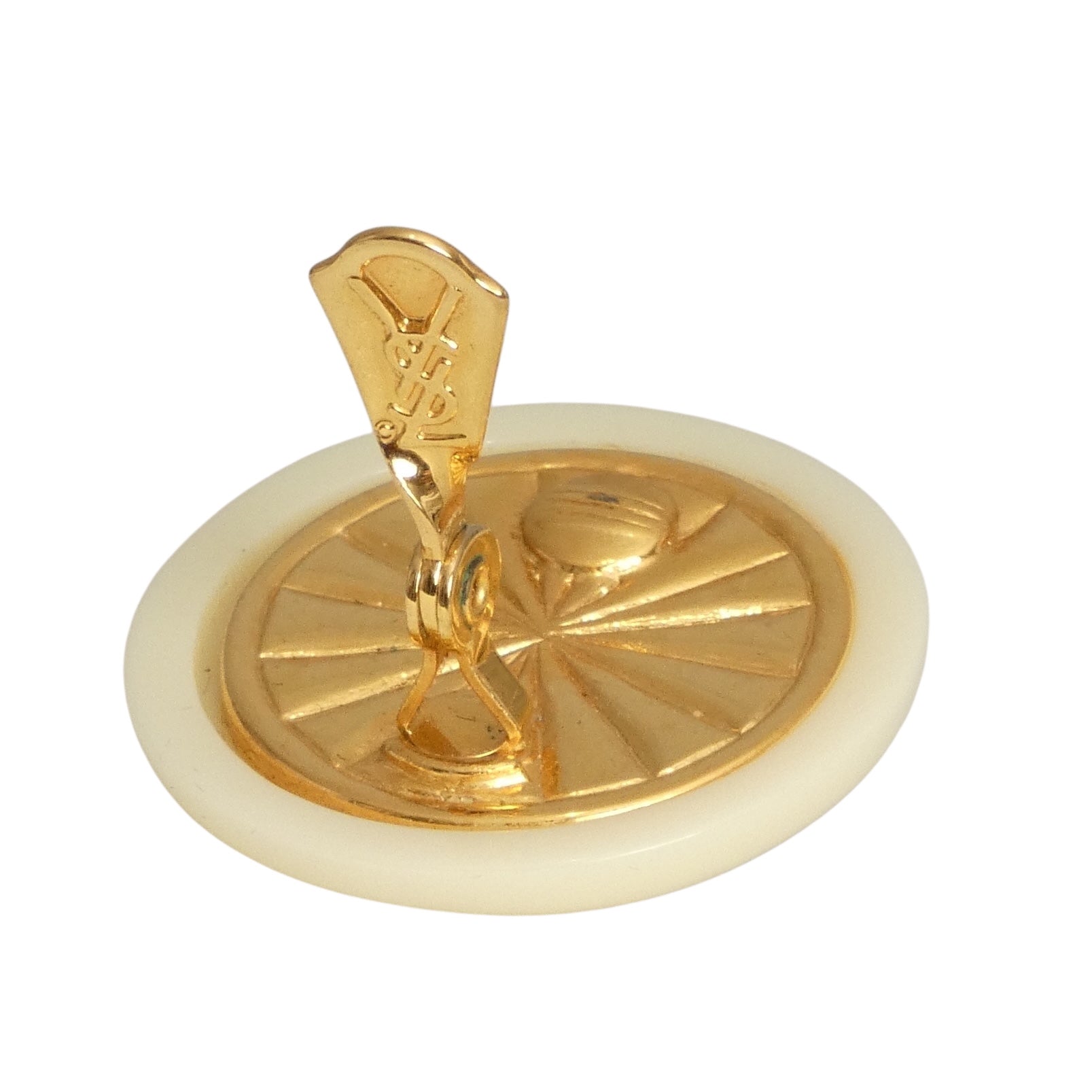 Description: Give your accessory collection a playful boost with these eye-catching Yves Saint Laurent earrings from the 1990s! Featuring a unique eye-shaped design with layered discs in bold black and ivory, their wavy etched details add a fun vintage twist. The gold-tone metal backs with tension clips keep them snug and comfy all day long. Perfect for adding a splash of chic sophistication, these statement earrings will make your style truly shine!
