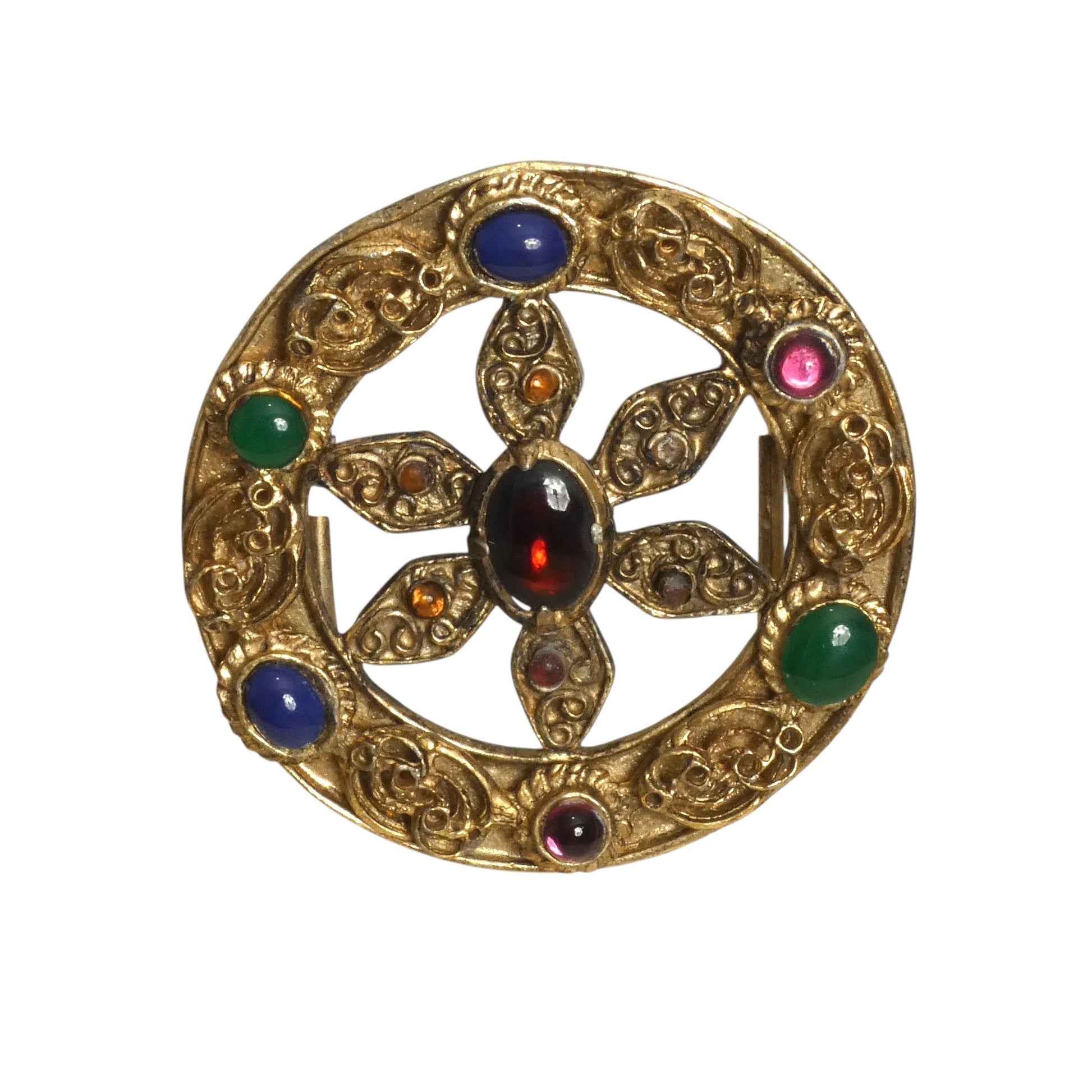 Description: This stunning 1970s buckle is crafted from antiqued gold-tone brass, showcasing intricate spiral metalwork adorned with delicate Gripoix stones.