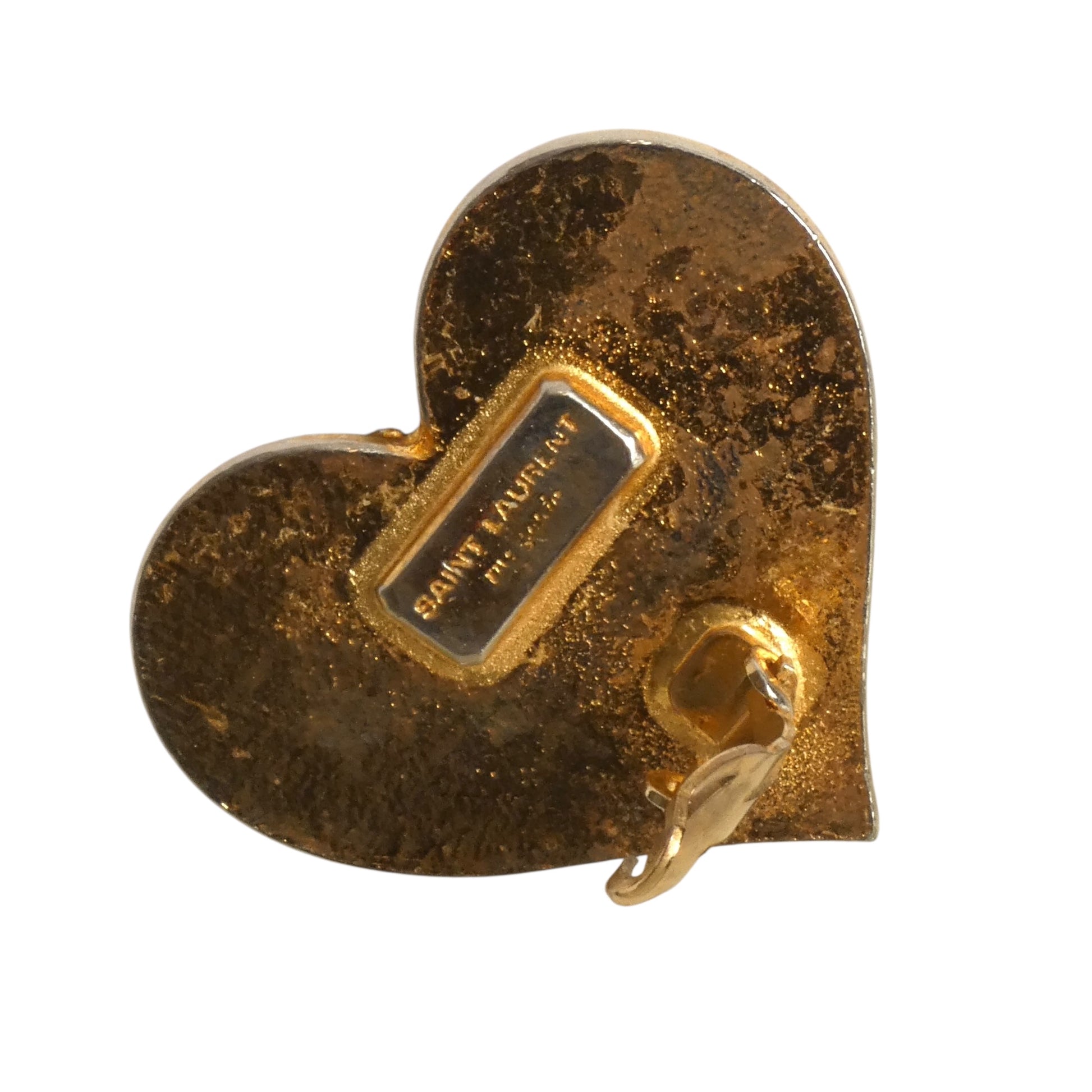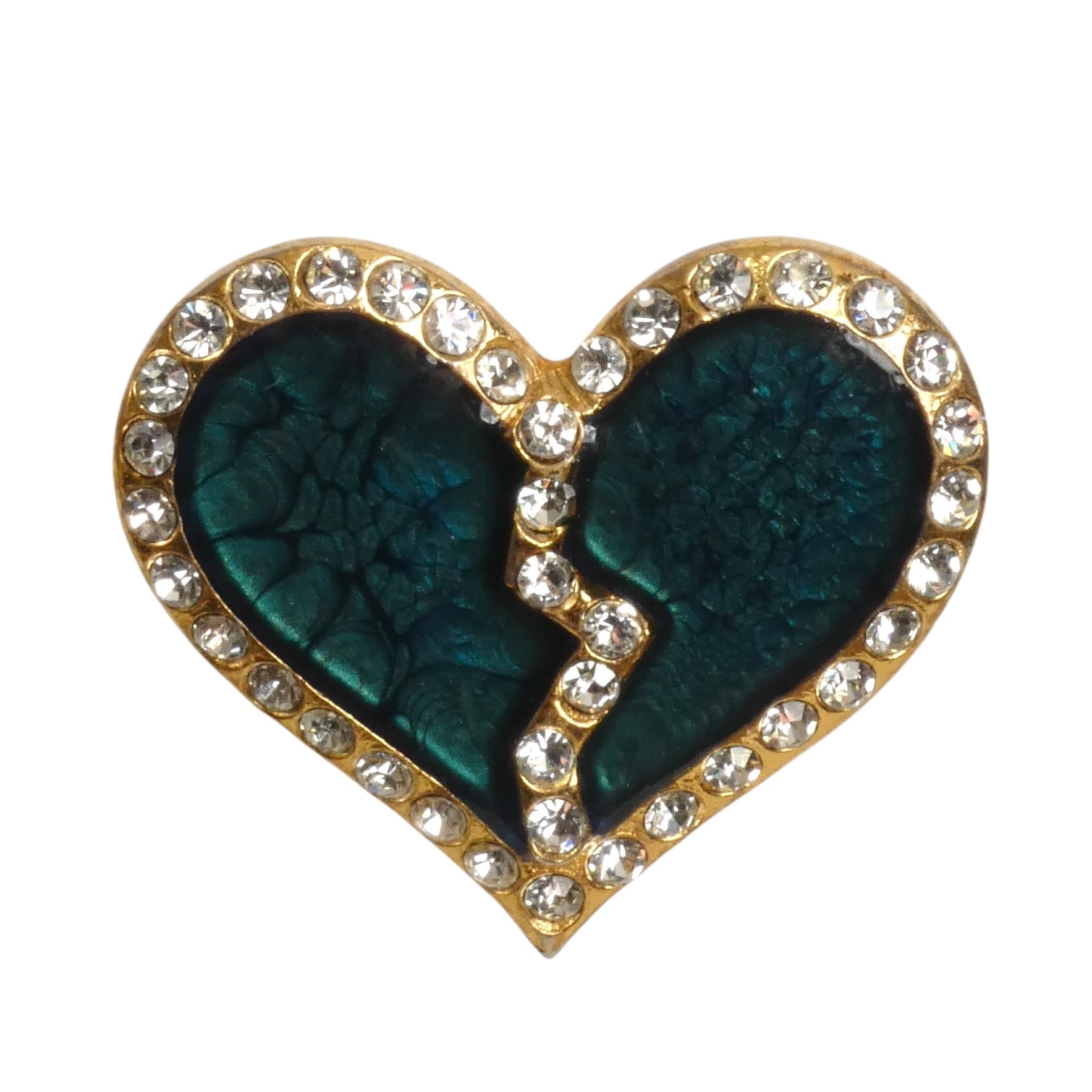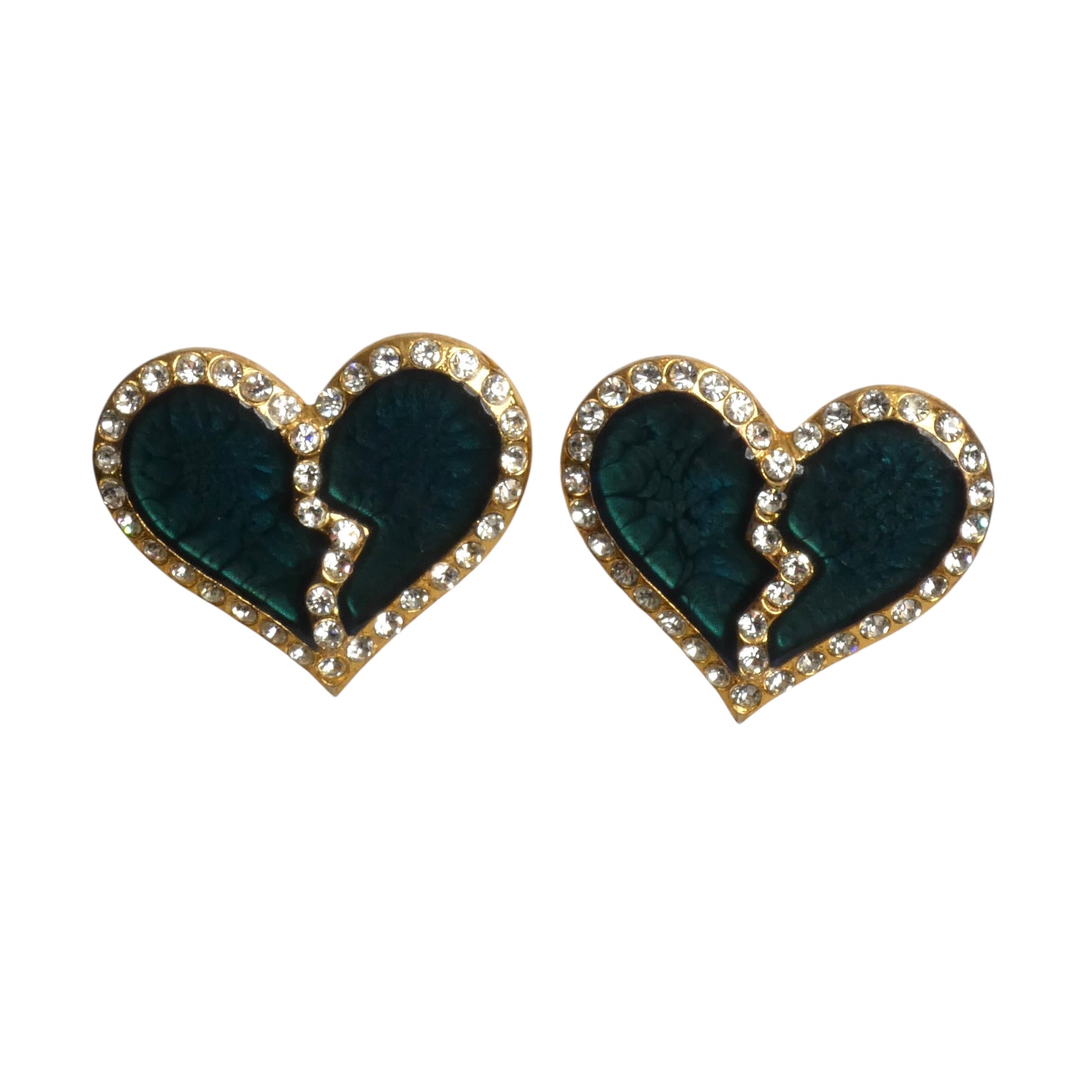 Description: From the 1980s, these Yves Saint Laurent clip-on earrings showcase a heart-shaped design crafted in gold-tone metal. The green enamel adds vivid color, while sparkling rhinestones outline the heart and highlight a central crack detail, creating an elegant contrast. These vintage accessories combine sophisticated craftsmanship with unique character, perfect for collectors and style connoisseurs seeking iconic statement pieces.