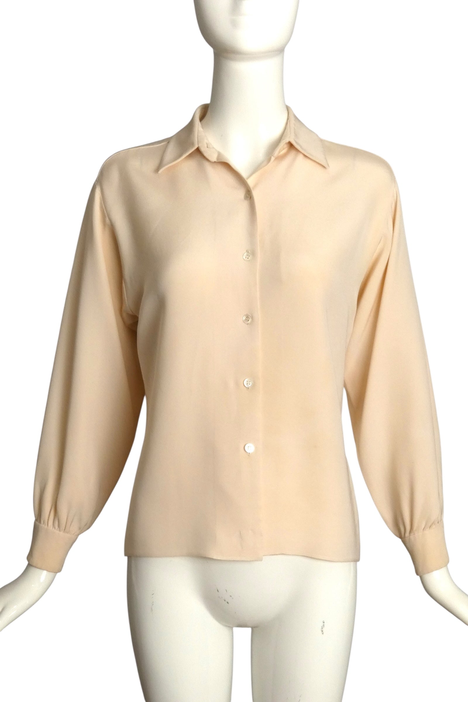 Description: Step back in time with this playful 1980s Yves Saint Laurent silk faille blouse in a creamy ivory shade. Designed with a chic small collar and delicate button closures down the front, it perfectly blends elegance with vintage charm. The long sleeves gather at buttoned cuffs, adding a flirty touch to this haute couture piece..