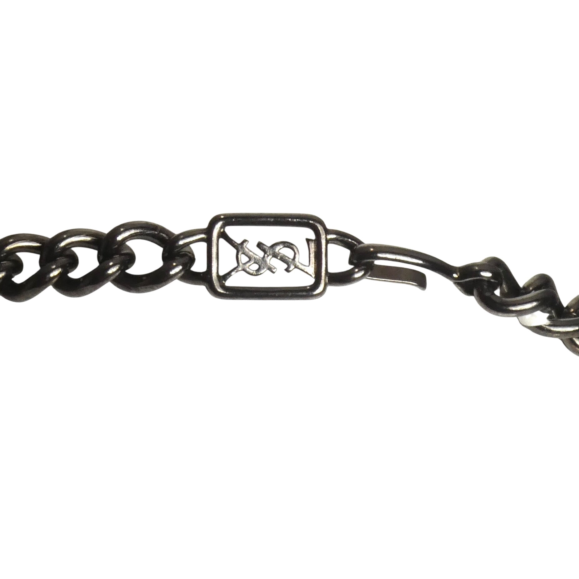 Description: This 1980s Yves Saint Laurent necklace features a dark silver metal chain secured with a hook and finished with a YSL plate at the back. Oval enamel charms in a variety of colors dangle elegantly, interspersed with reflective square mirrored charms, combining vibrant hues with striking shine for a sophisticated vintage statement.