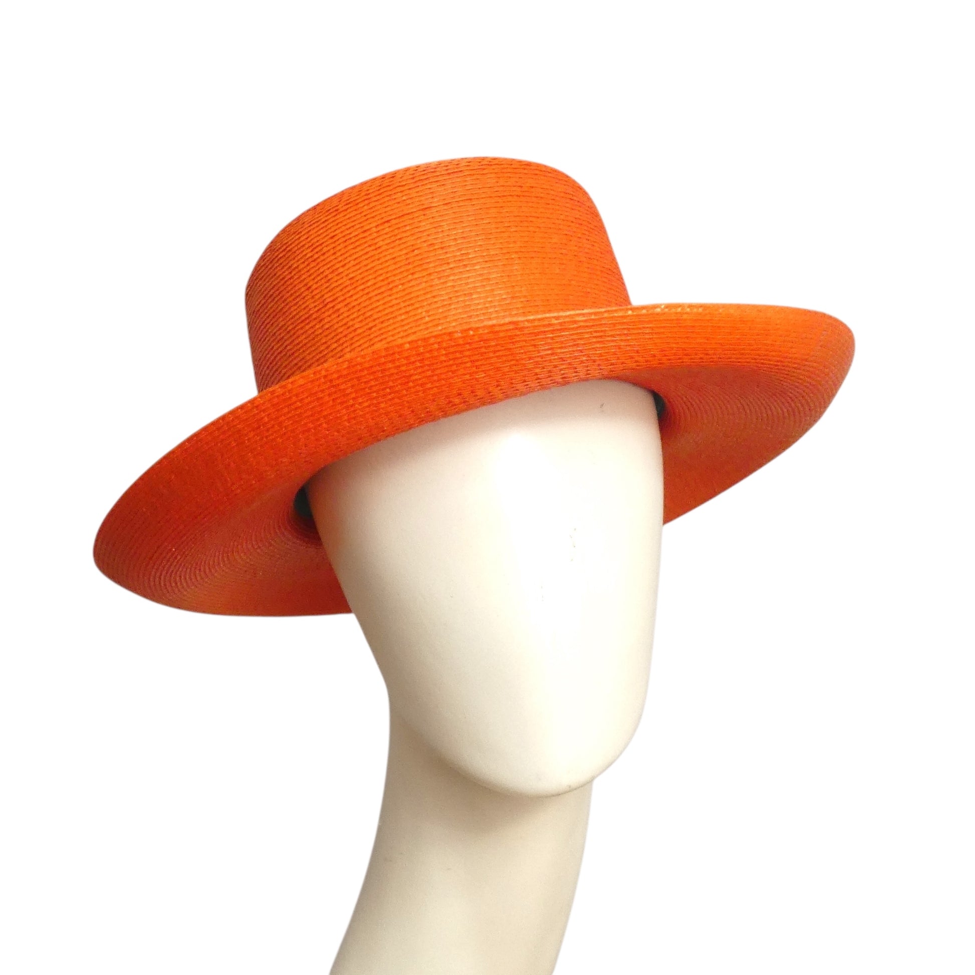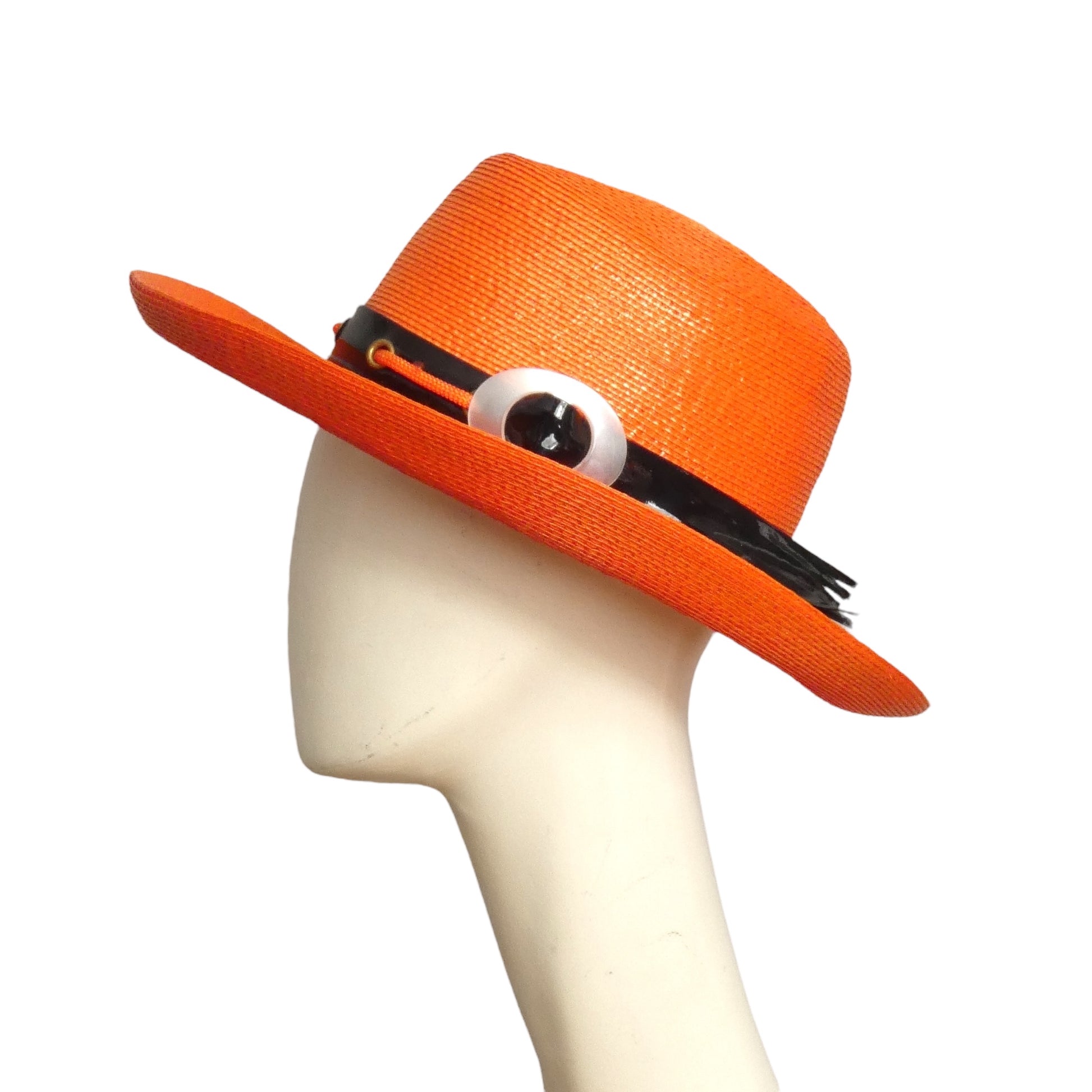 Description: This vibrant 1980s orange straw fedora features a glossy finish, a deep crown, and a gently curved brim. A sleek black patent band wraps around the base, threaded with orange laces through brass grommets, and finished with a frosted lucite buckle on the side for a fun, retro flair.