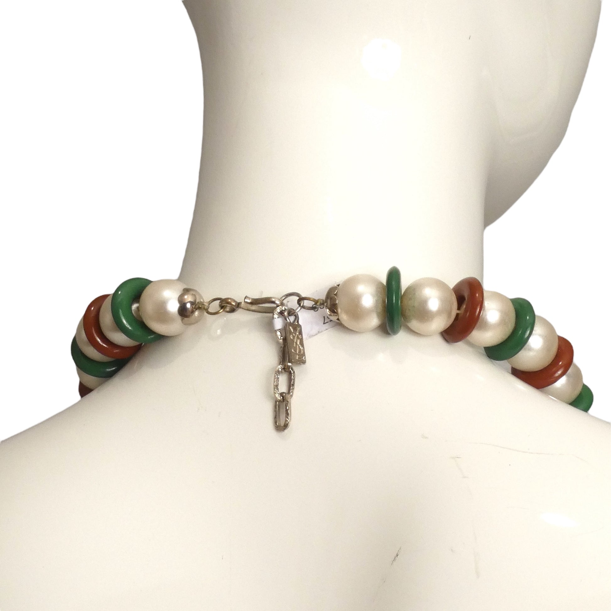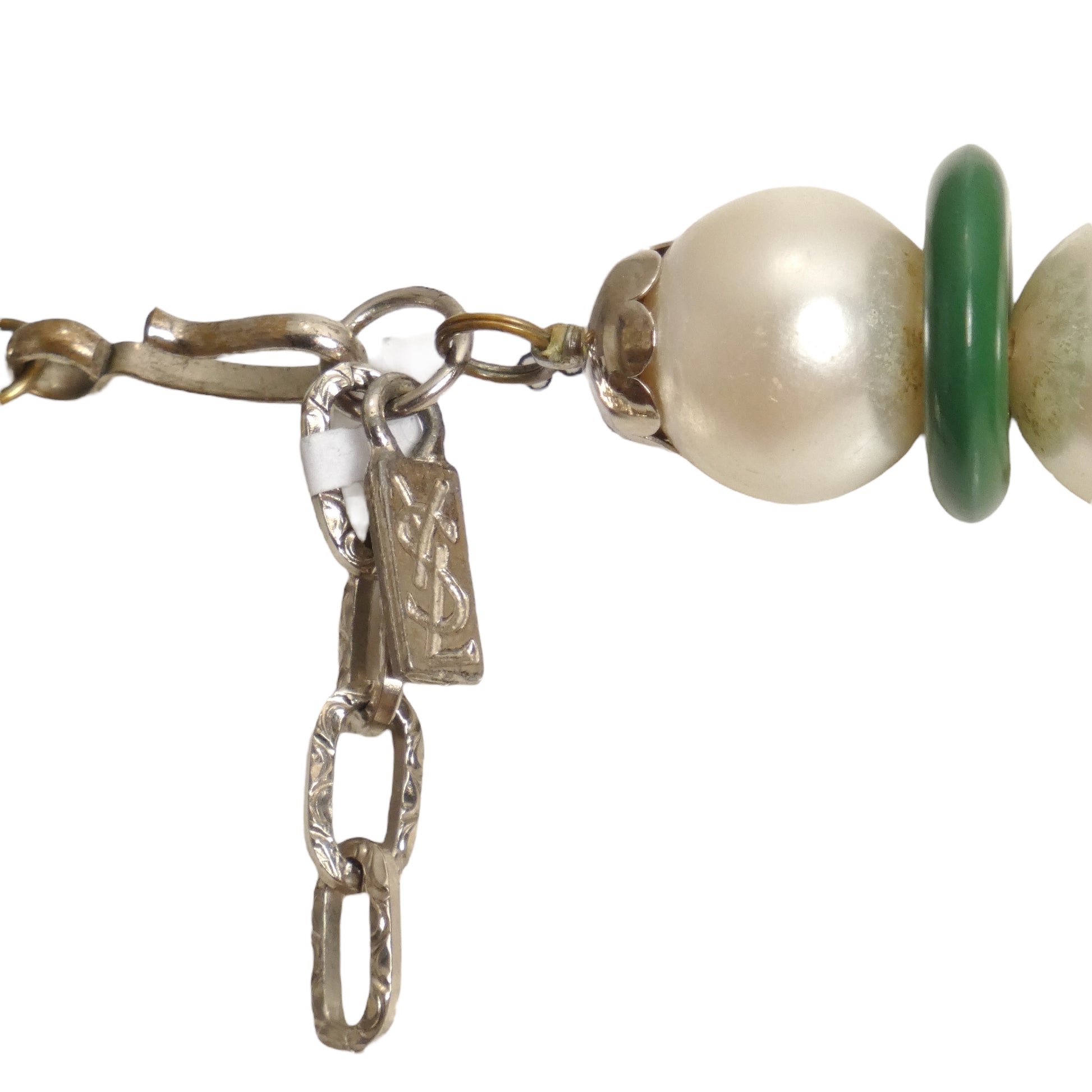 Description: Step up your style with this fabulous Yves Saint Laurent necklace from the 1970s! Showcasing big ivory pearls mixed with lively green and warm brown discs, it’s a playful pop of vintage glam. Strung on a dainty ivory cord and fastened with a silver hook and chain, it promises a comfy fit. The iconic silver "YSL" tag seals the deal with authentic luxury. Add a dash of retro charm and let this necklace be your new favorite statement piece!