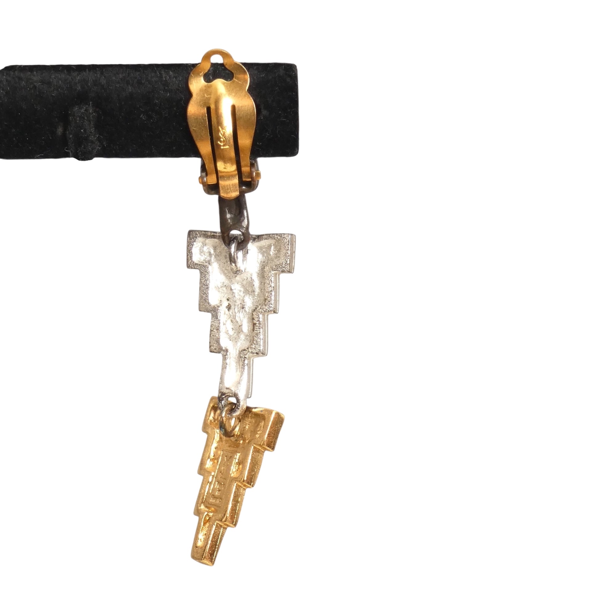 Description: Boost your style with these fabulous Yves Saint Laurent earrings from the 1970s! Featuring a sculptural drop design in a mix of pewter, silver, and gold tones, they effortlessly complement any outfit. With secure clip backs for all-day comfort, these earrings are perfect for adding a splash of vintage flair to your collection. A playful must-have for every fashion lover!