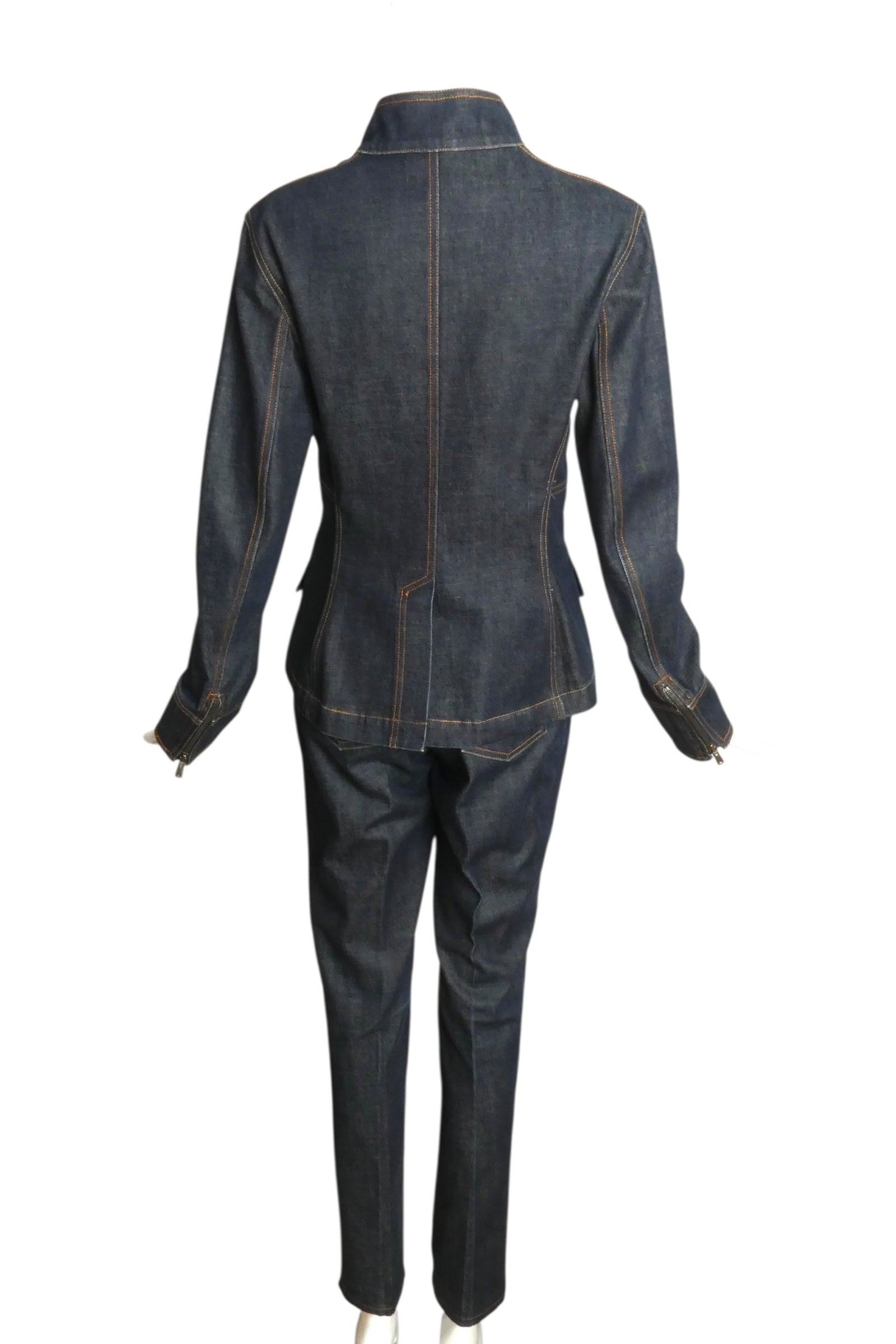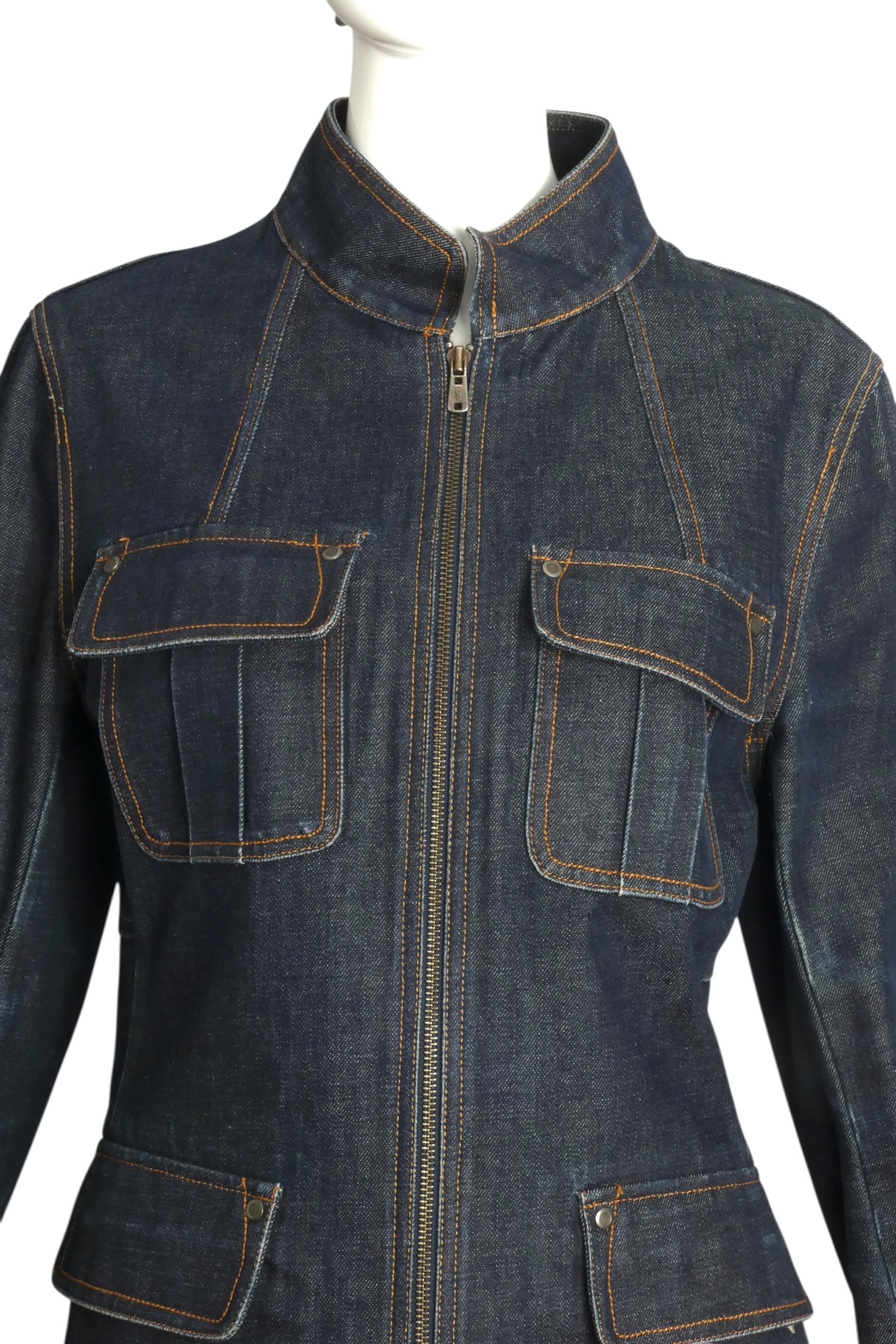 Description: Step out in style with this fabulous YVES SAINT LAURENT denim safari pant suit from the iconic Tom Ford era. The jacket features a sleek stand collar, zip front, and chic flap pockets, while the long sleeves finish with zippered cuffs for an unexpected edge. Matching denim jeans complete the look, boasting a standout YSL embroidered detail on the back. Perfect for turning heads and adding a playful twist to your wardrobe!