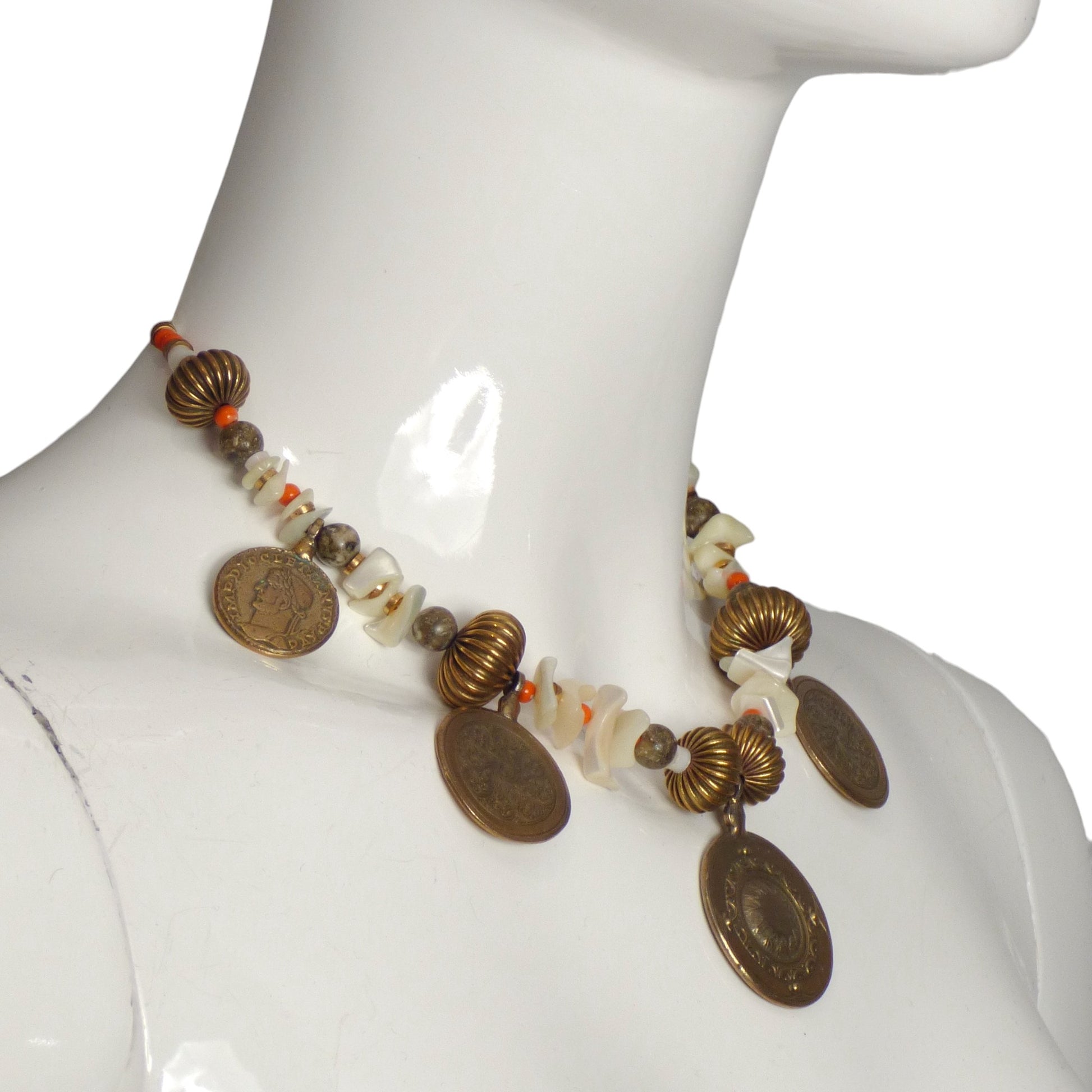 Description: Experience the beauty and luxury of this exquisite necklace, featuring a stunning mix of abalone and coral beads, accented with brass spacers and large spiral beads. The intricate drop medallions add a touch of elegance to this truly unique piece.