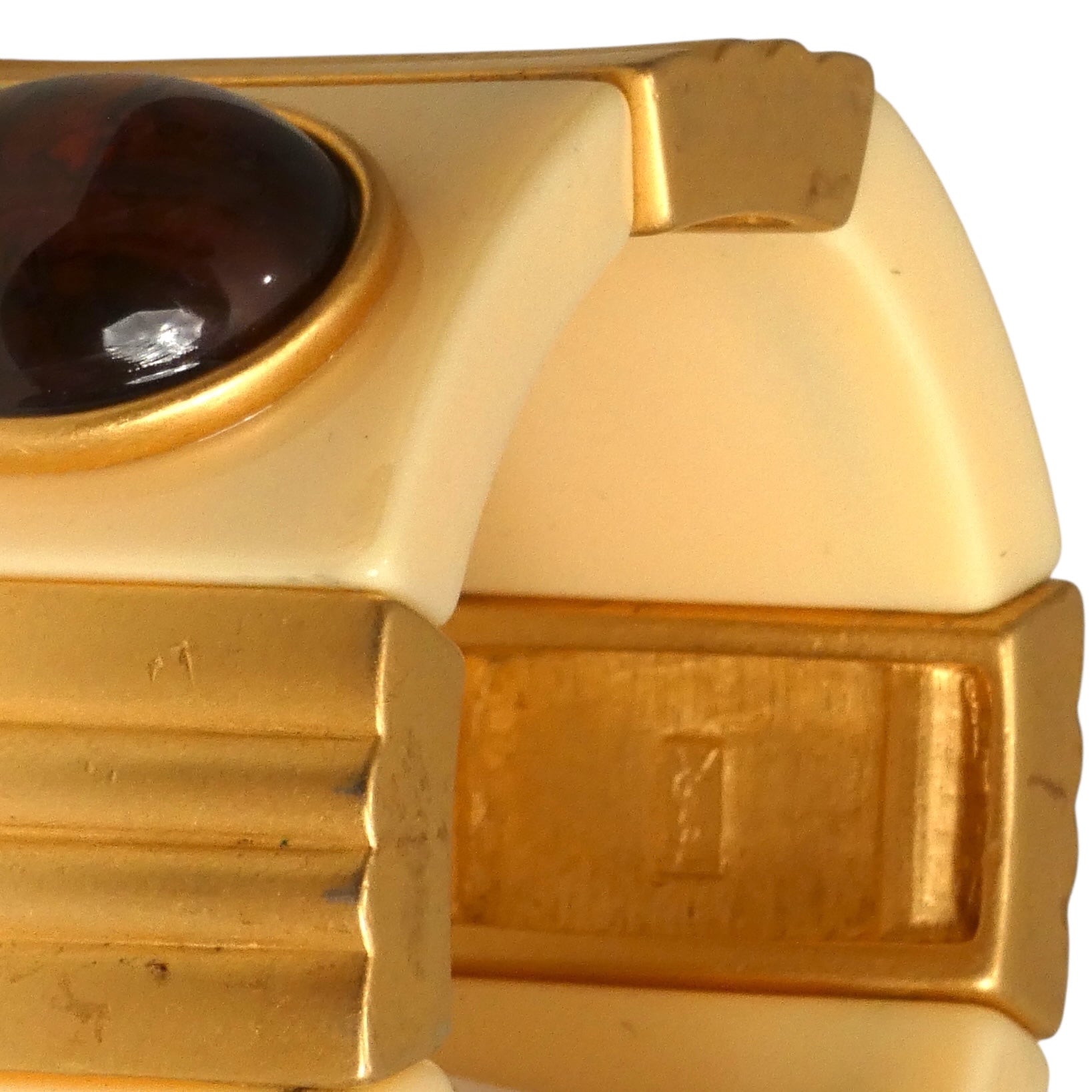 Description: Elevate your style with the Yves Saint Laurent Metal & Rhinestone Lucite Bangle! This playful bracelet combines ivory acrylic and gold-tone metal with sparkling amber stones for a chic, eye-catching look. Its expandable design ensures a comfy fit, perfect for adding a dash of glam to any outfit—whether you're dressing up or keeping it casual. Let this bangle be your new favorite statement piece that effortlessly shines with your unique flair!