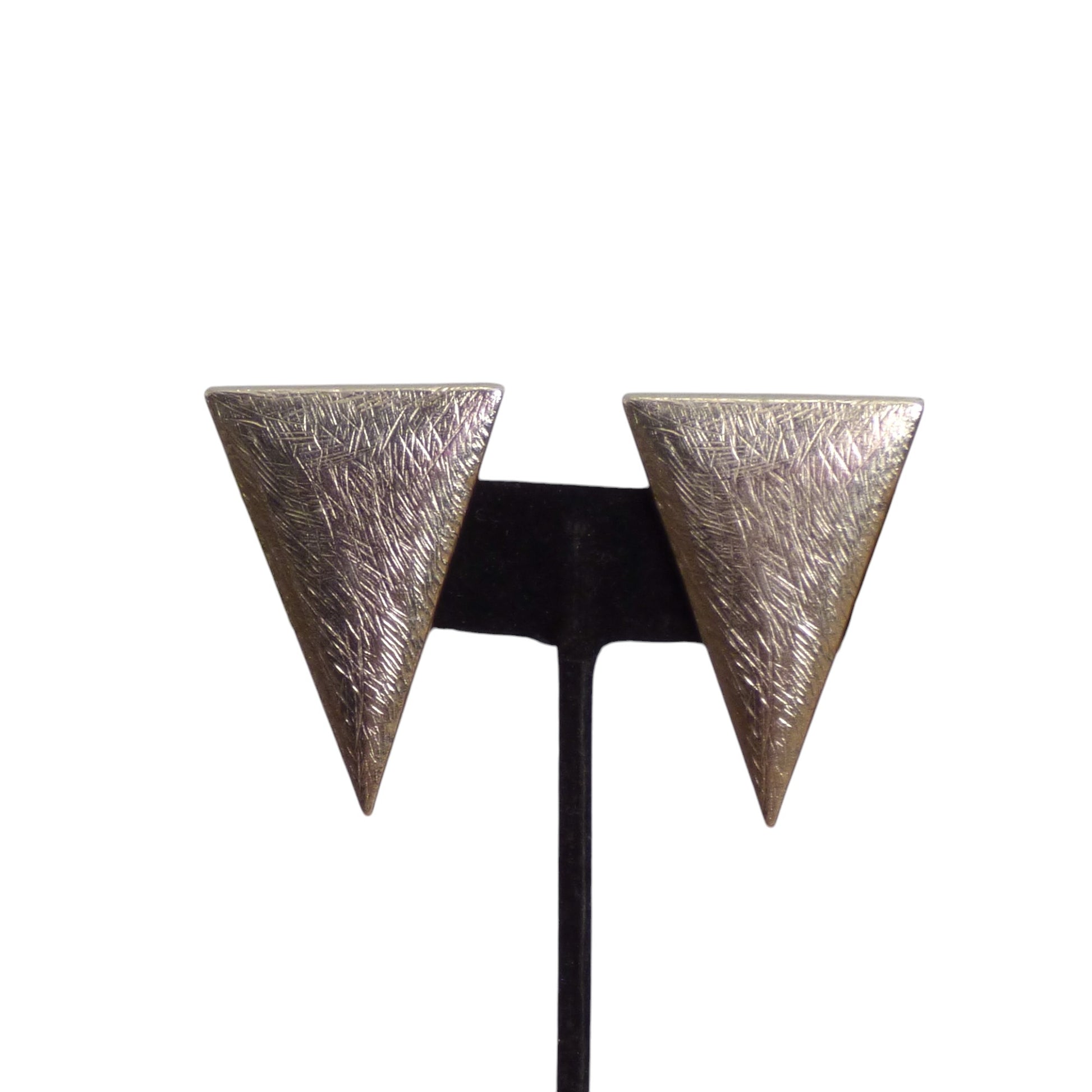 Description: Dazzle and enchant with these YVES SAINT LAURENT silver tone triangle earrings, delicately detailed with an etched scratch pattern and secured with elegant tension clip backs. Create a stunning statement with these luxurious and exclusive earrings, crafted from premium metal materials.