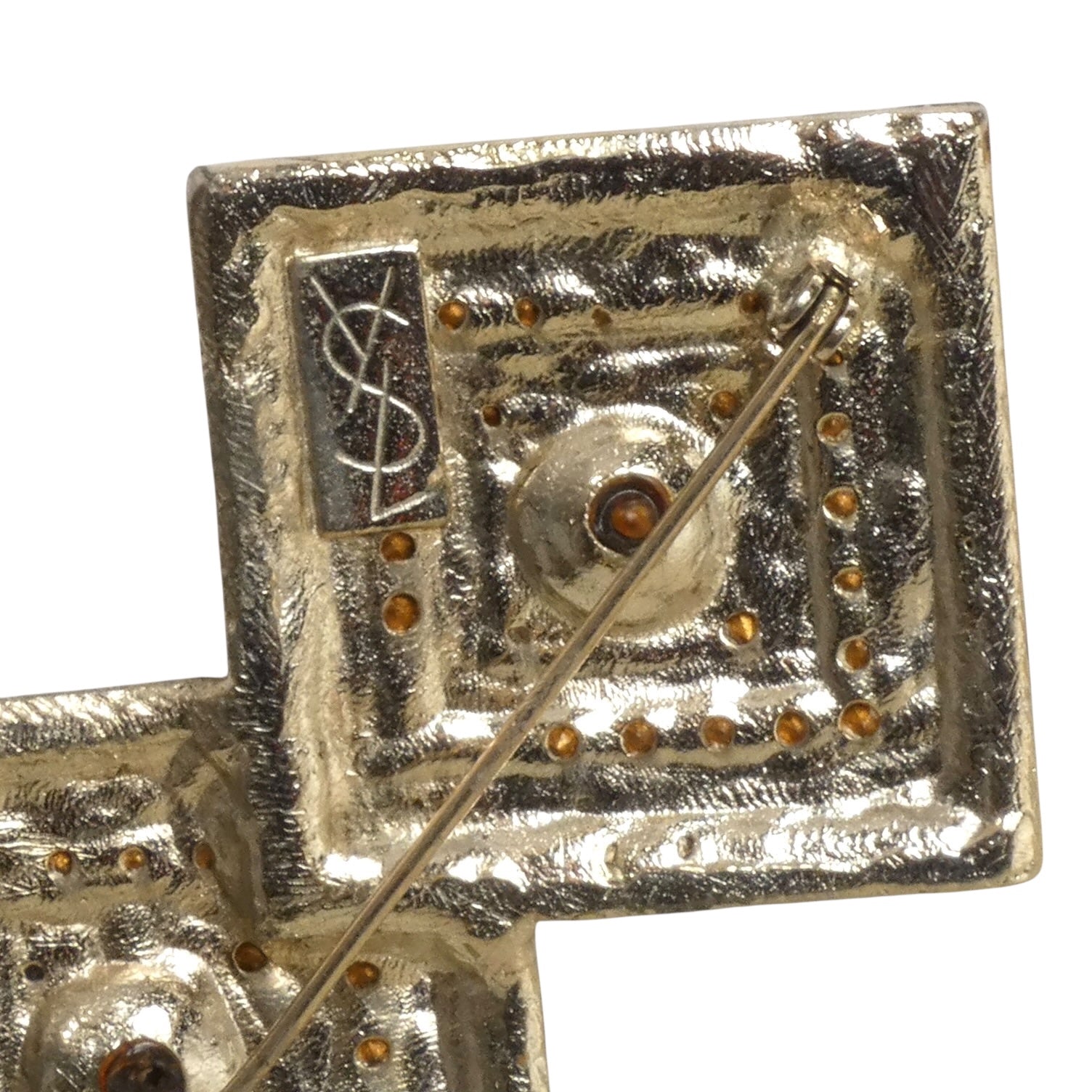 Description: This early Yves Saint Laurent brooch from the late 1960s to early 1970s features a sophisticated design of graduated silver-gilt squares adorned with sparkling rhinestones. Each square centers on a striking black faceted stone, creating a refined contrast. The piece is finished with a secure locking pin back, exemplifying YSL’s timeless elegance from this era.