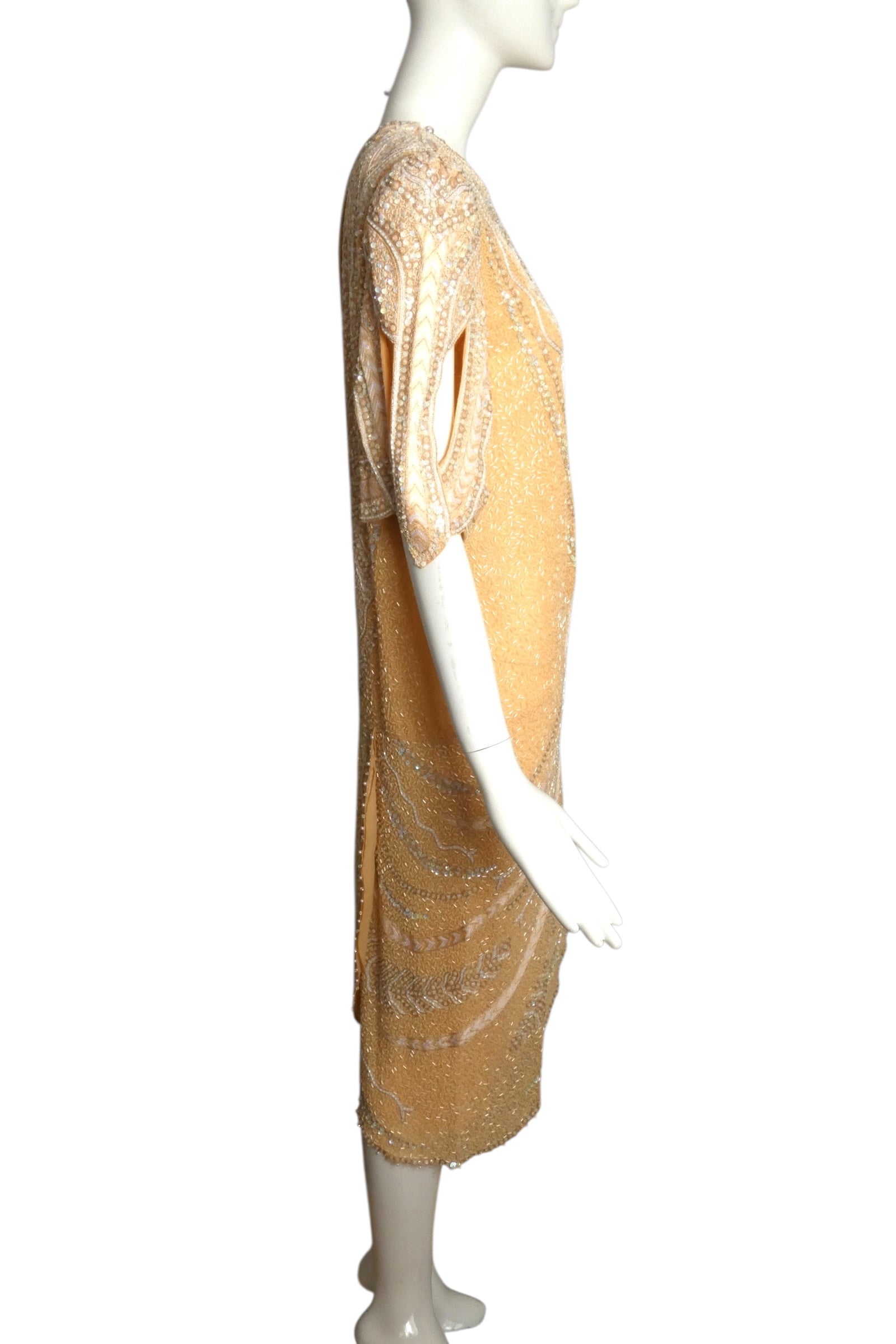 Description: This exquisite 1980s Zandra Rhodes evening dress exemplifies the designer's signature maximalist aesthetic. Crafted in luxurious peach silk chiffon, the columnar silhouette showcases an extraordinary array of hand-applied embellishments—intricate appliqué ribbons, delicate embroidery, shimmering bugle beads, and iridescent sequins. The scoop neckline is elegantly finished with opalescent pearls, while the short sleeves feature overlapping bands with strategic cutouts that create a sophisticated cage effect. The dramatic plunging back is anchored by criss-cross straps, adding architectural interest and movement. A museum-quality piece that captures the opulence and artistry of Rhodes' celebrated design legacy.